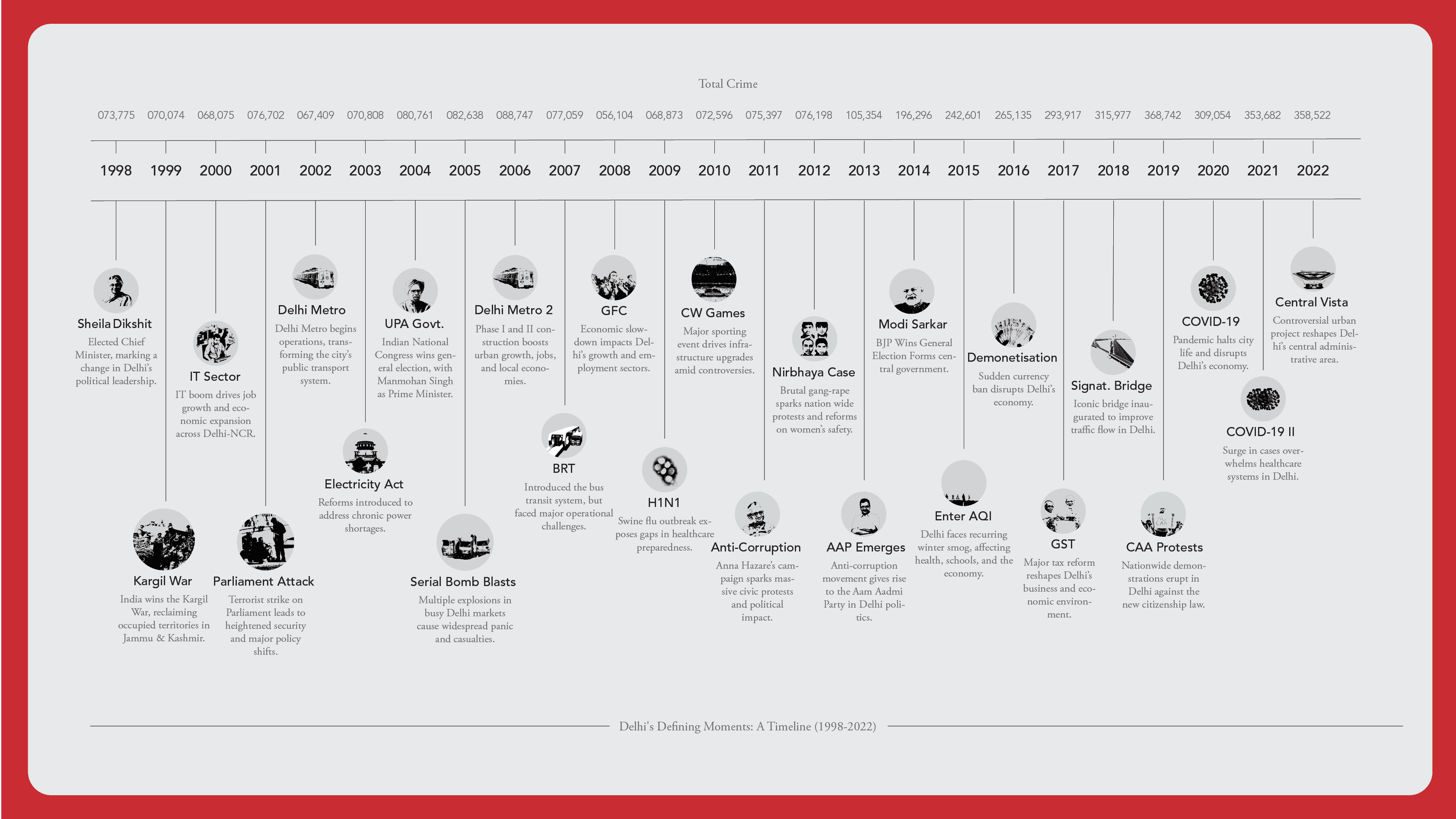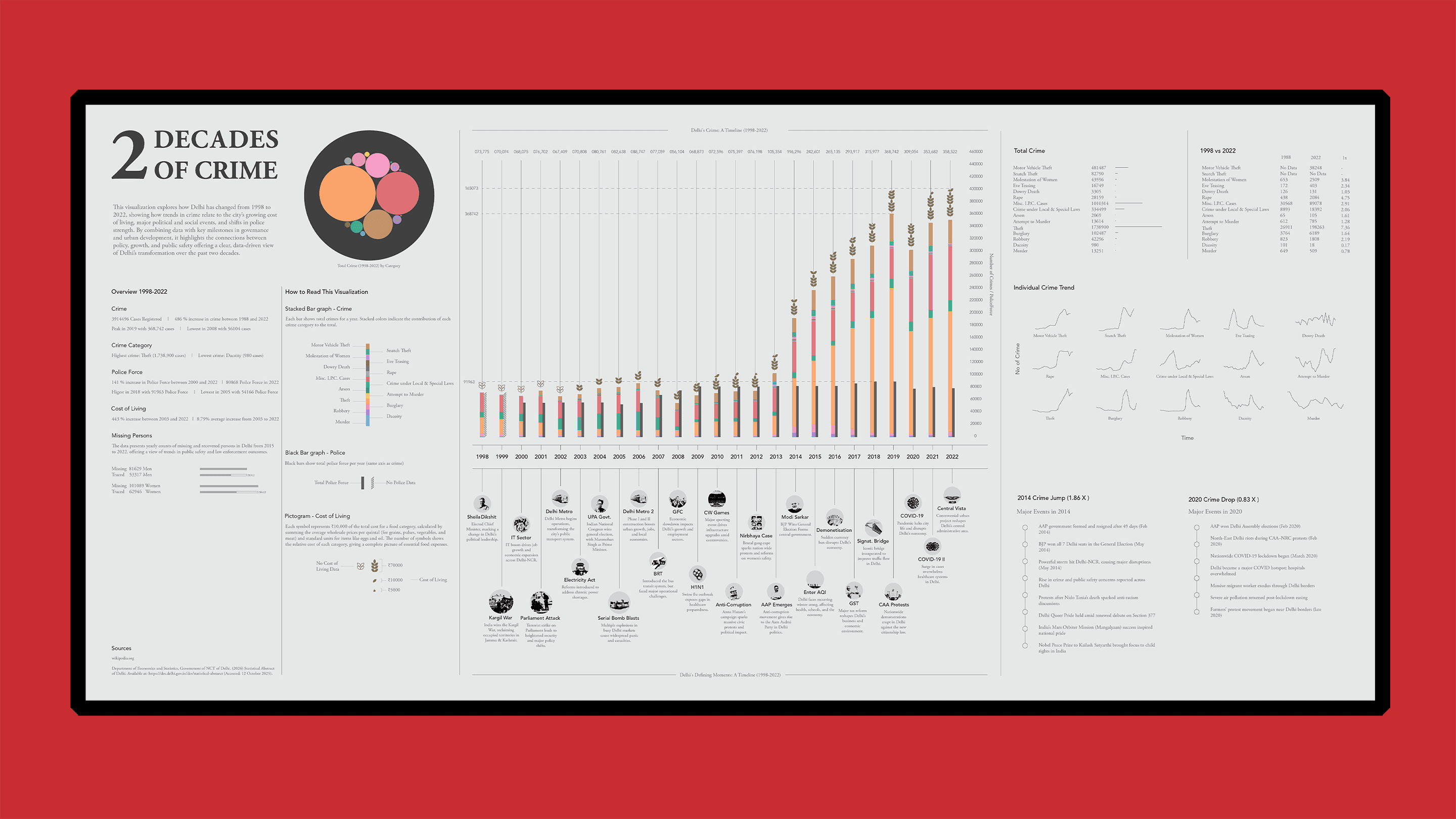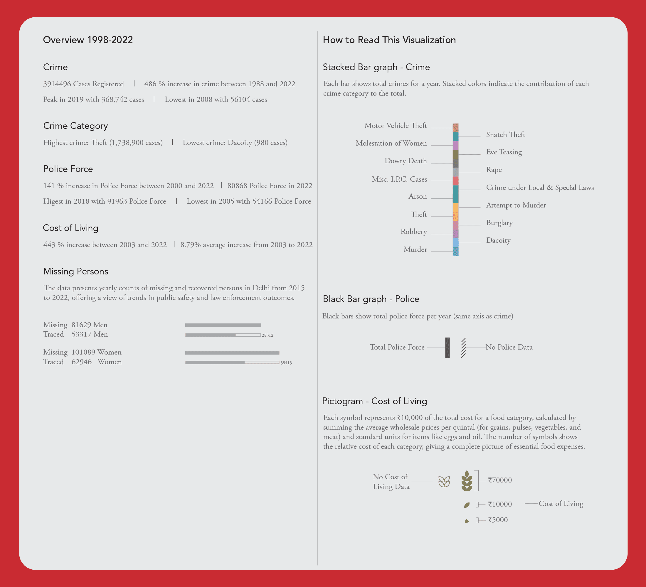 This visualization explores how Delhi has changed from 1998 to 2022, showing how trends in crime relate to the city’s growing cost of living, major political and social events, and shifts in police strength. By combining data with key milestones in governance and urban development, it highlights the connections between policy, growth, and public safety offering a clear, data-driven view of Delhi’s transformation over the past two decades.