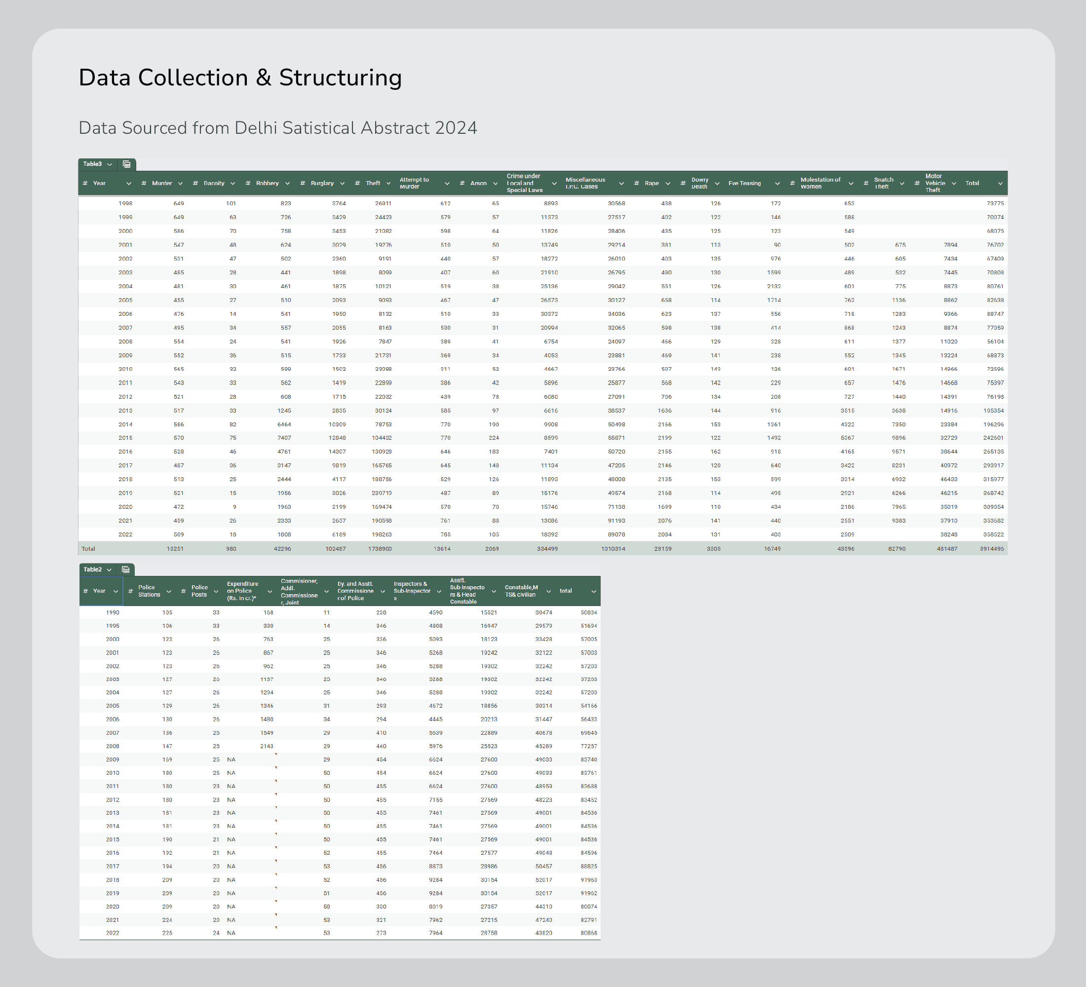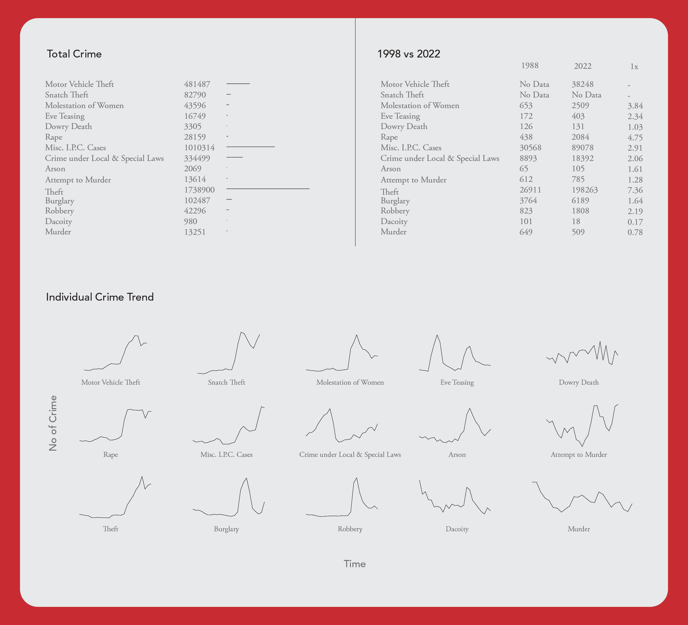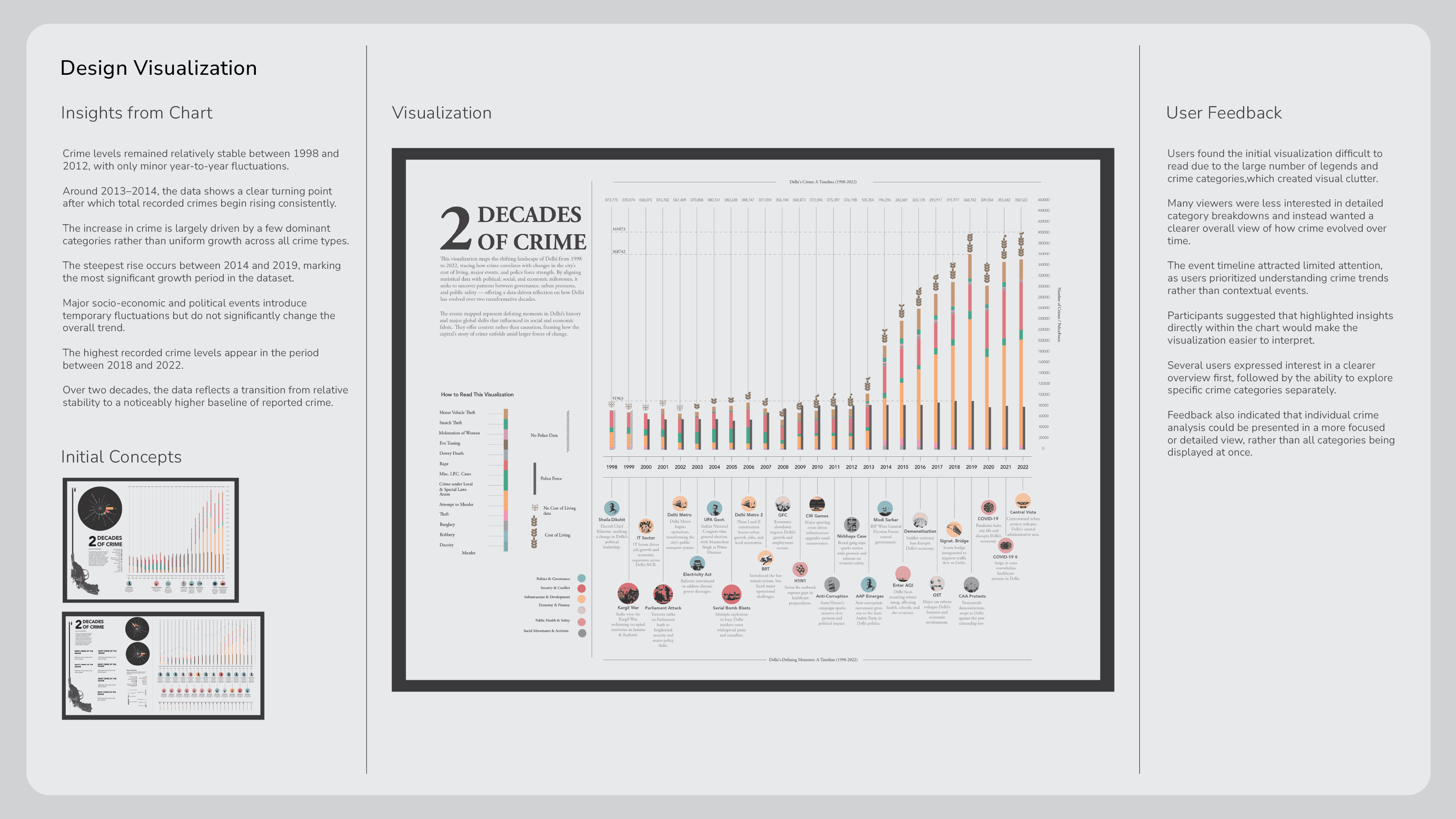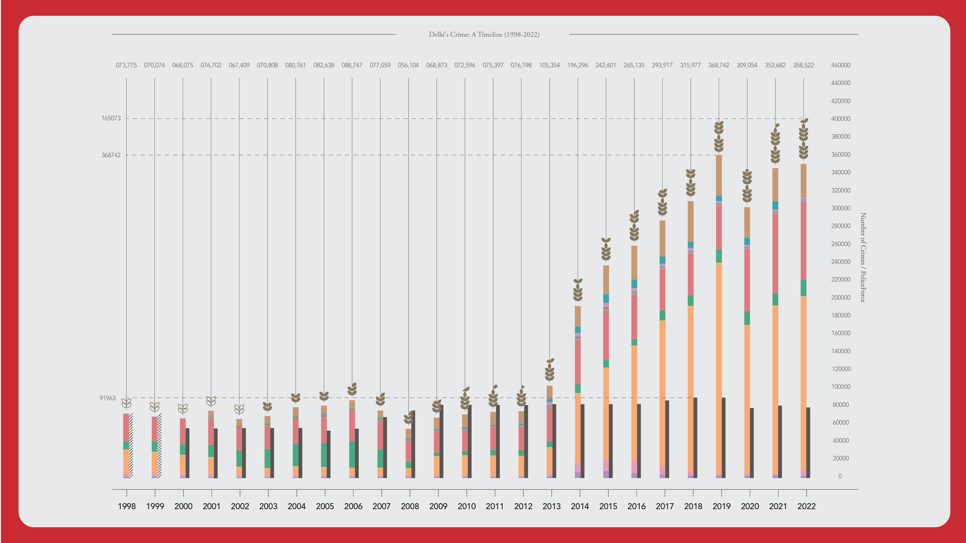 This visualization explores how Delhi has changed from 1998 to 2022, showing how trends in crime relate to the city’s growing cost of living, major political and social events, and shifts in police strength. By combining data with key milestones in governance and urban development, it highlights the connections between policy, growth, and public safety offering a clear, data-driven view of Delhi’s transformation over the past two decades.