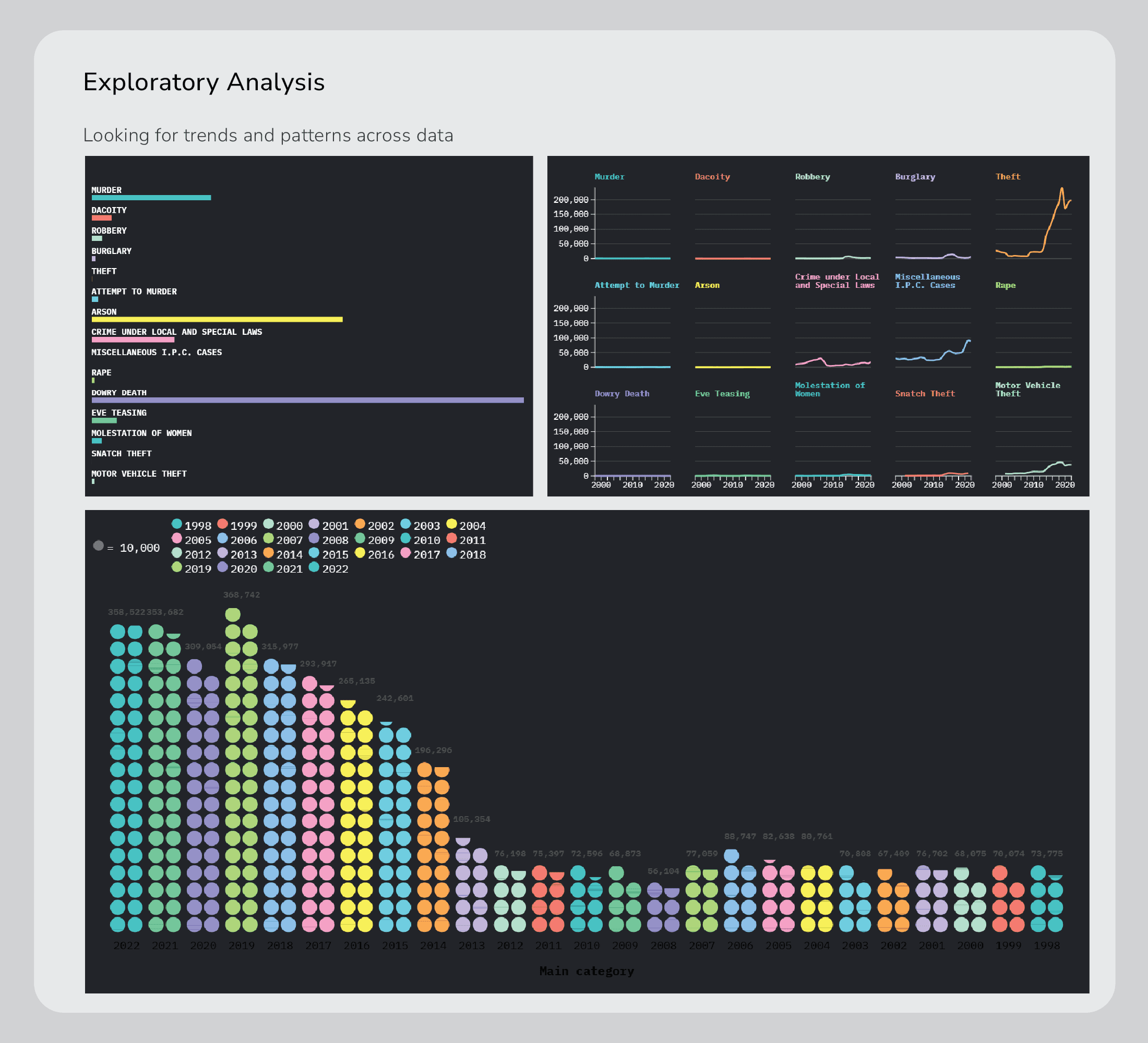 Public crime data is typically presented as tables and yearly reports, making long-term patterns difficult to interpret. The challenge was to transform two decades of data into a clear and readable visualization without overwhelming the viewer.