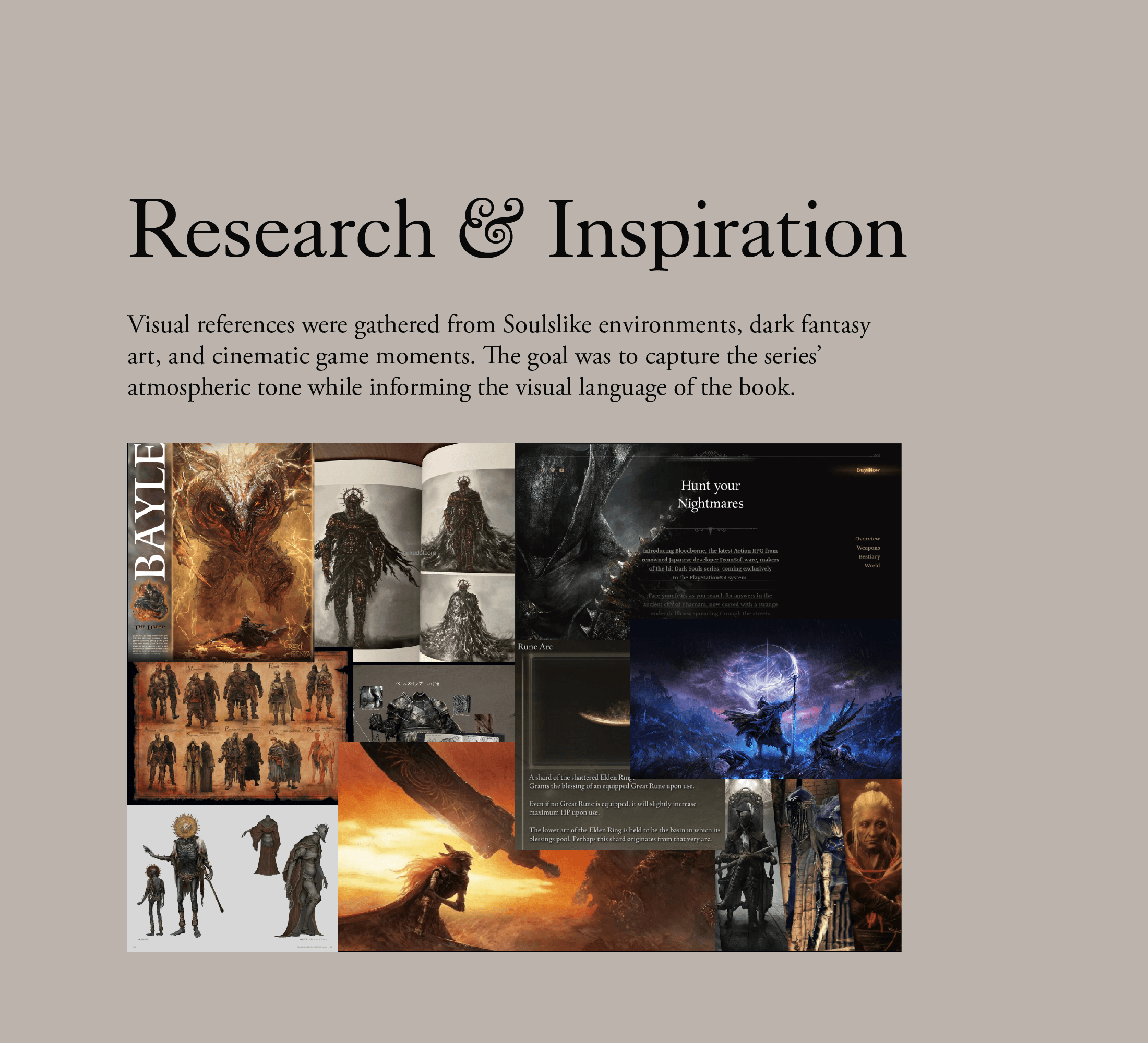 Translate the atmosphere and narrative depth of the Soulslike universe into an editorial format while balancing cinematic imagery with structured, readable typography.