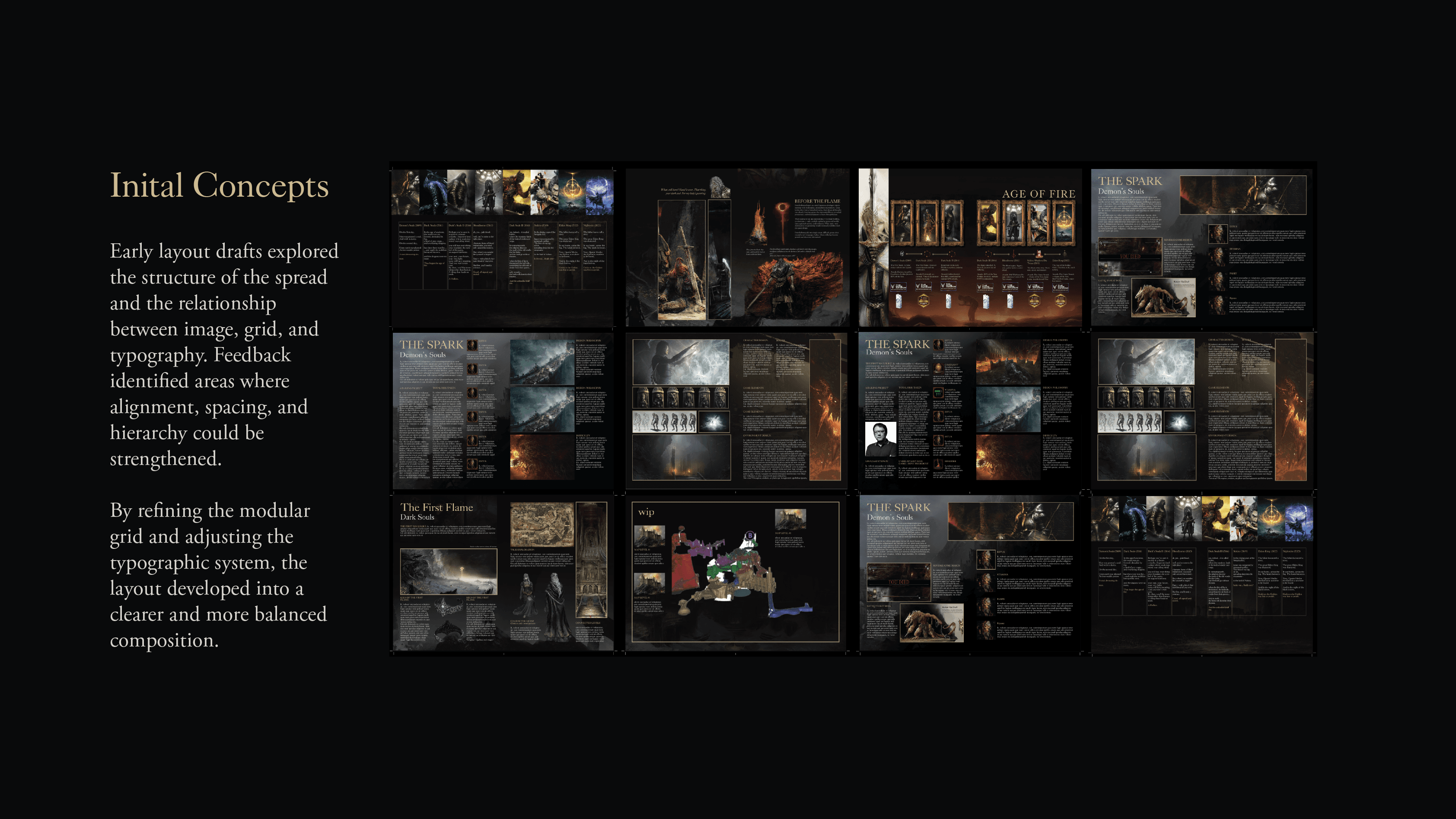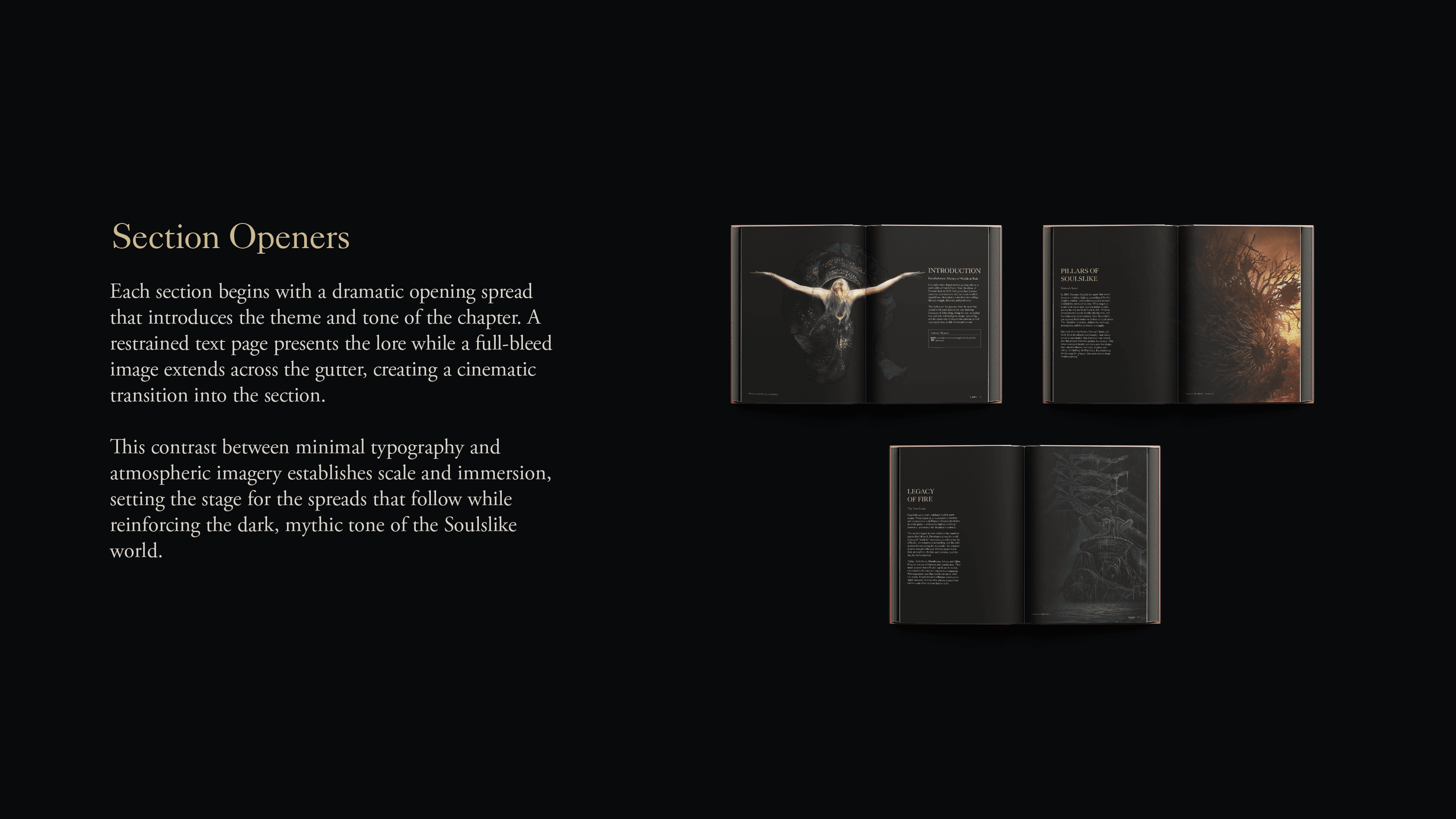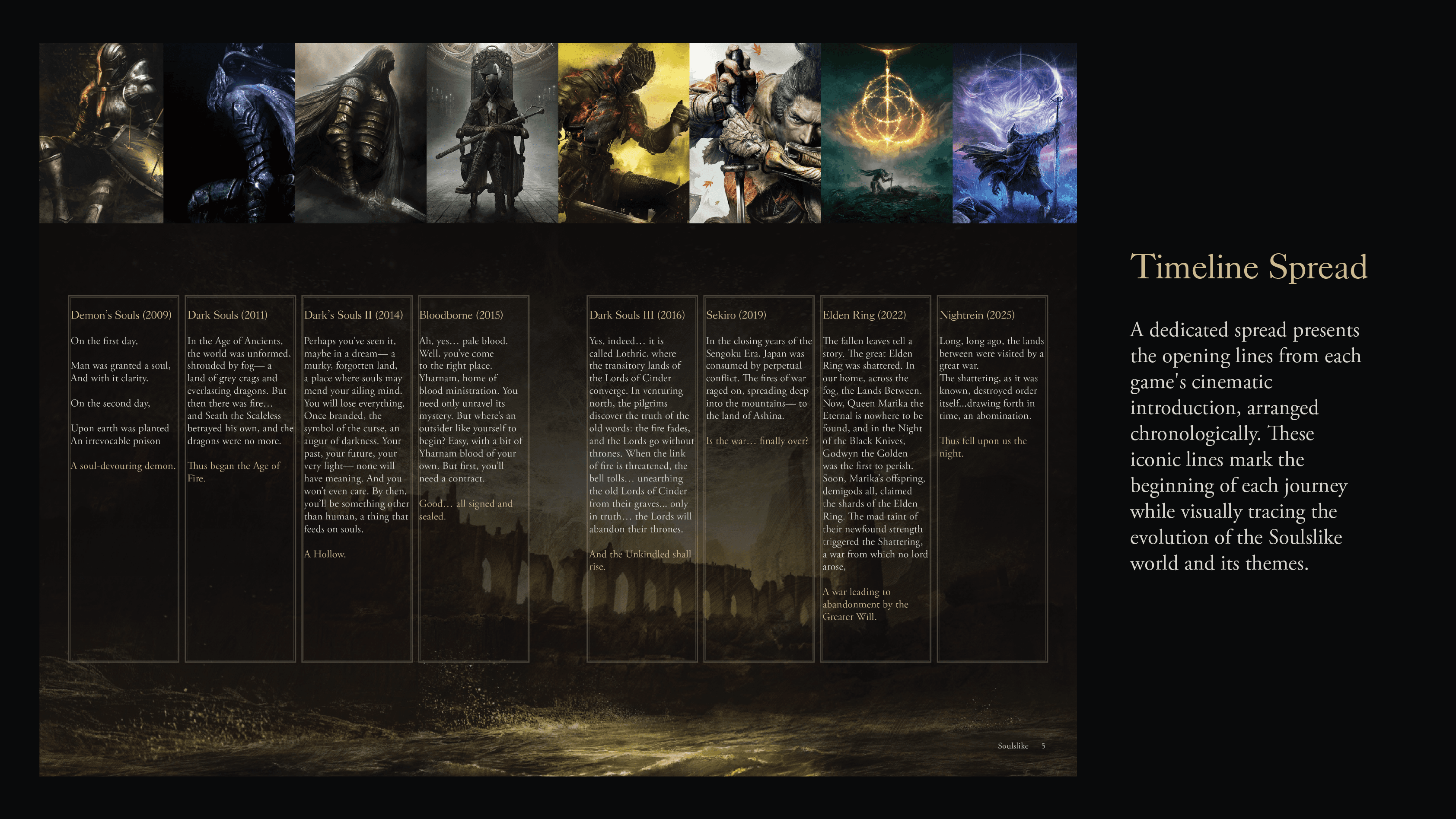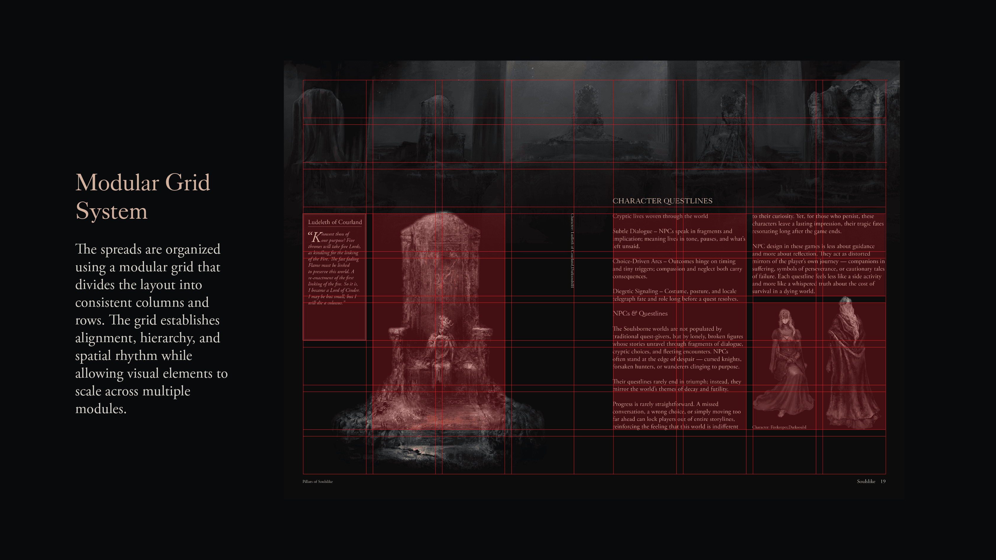 Design an editorial layout that captures the dark, atmospheric identity of the Soulslike universe while maintaining readability across image-heavy spreads and lore-driven text.