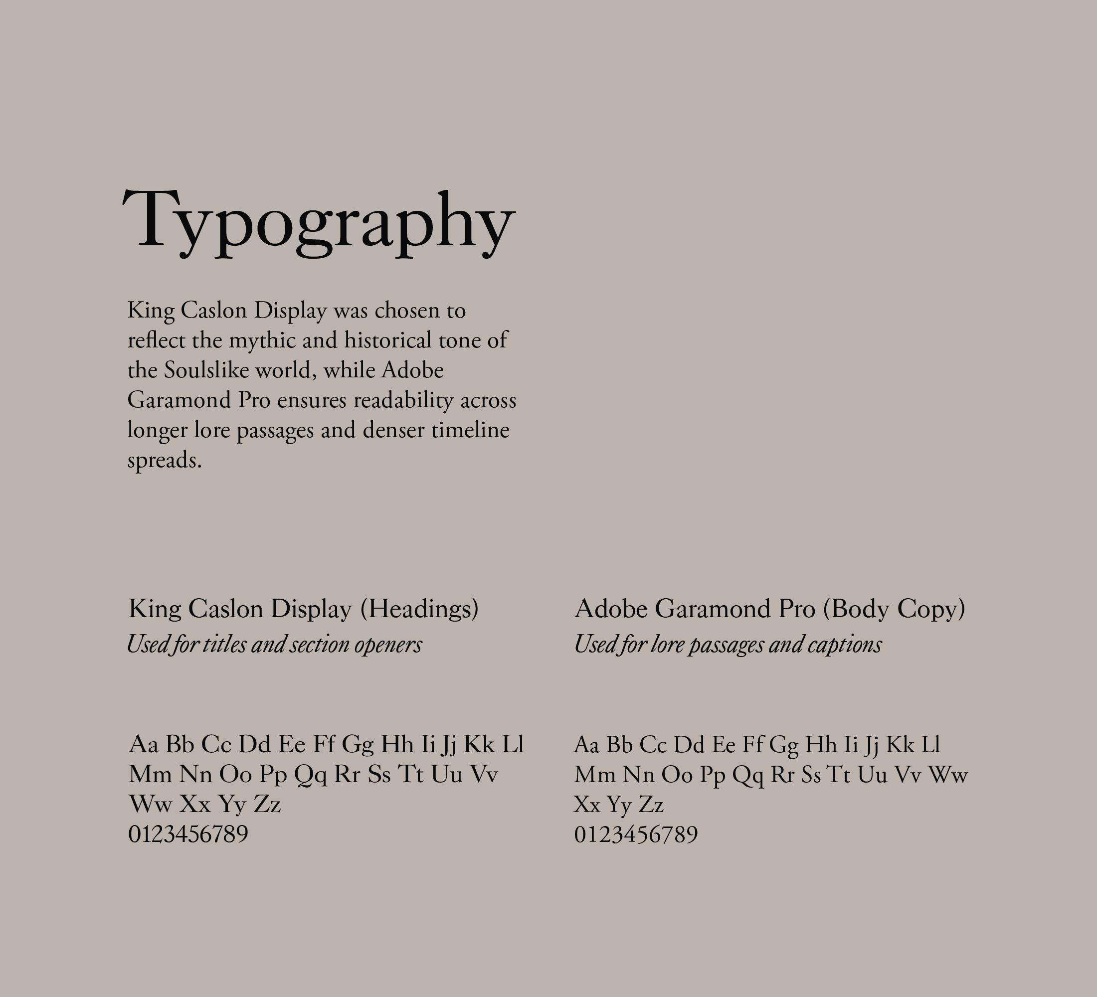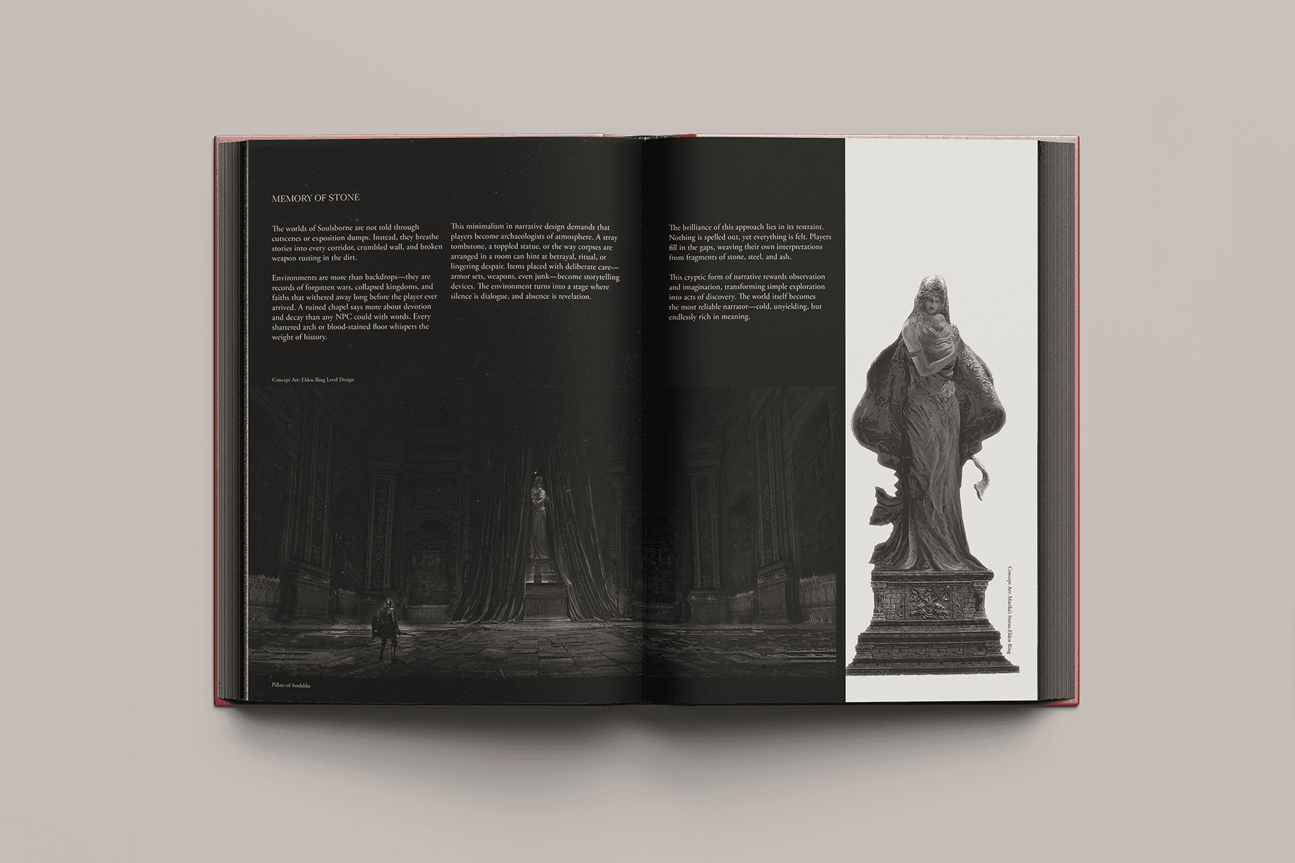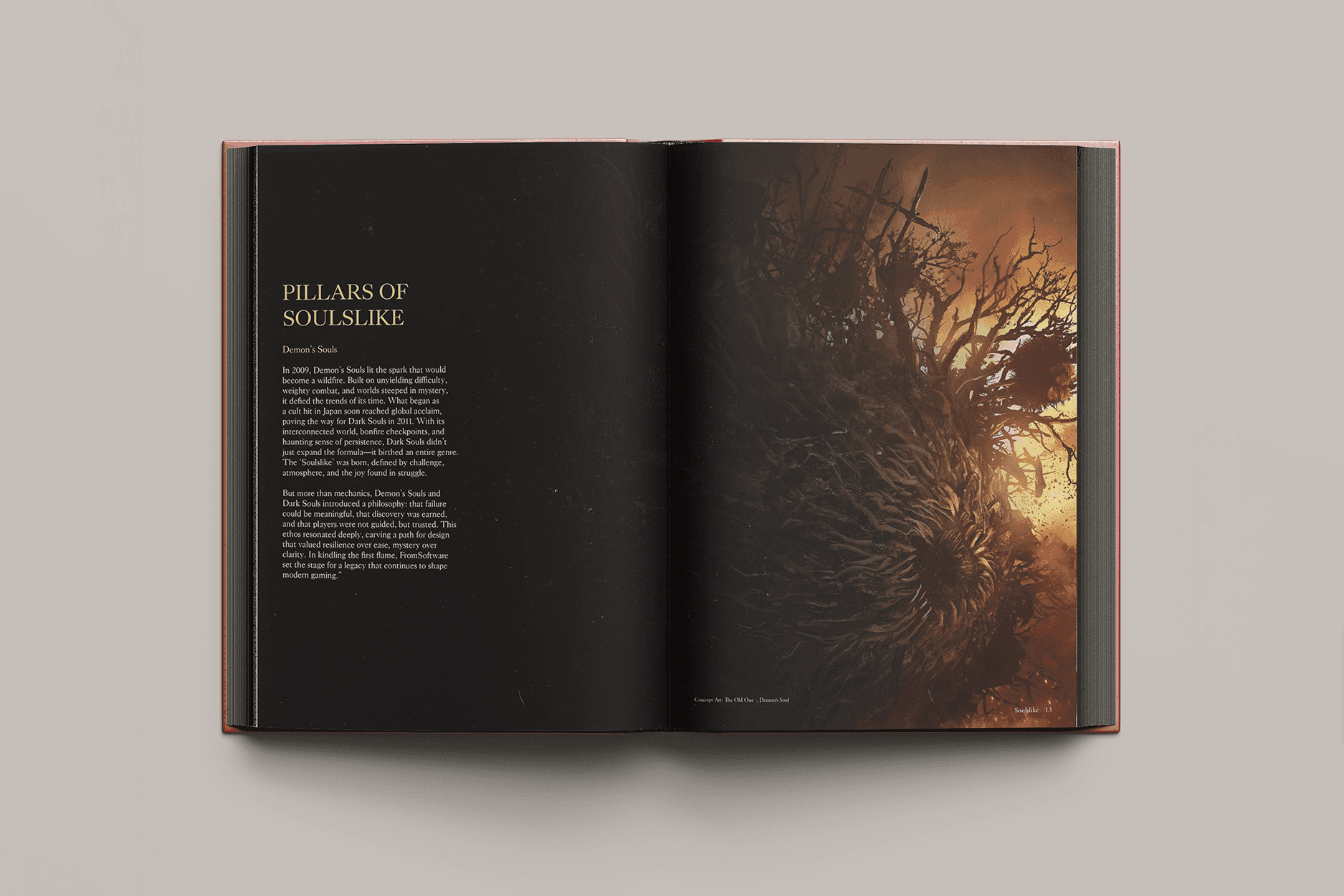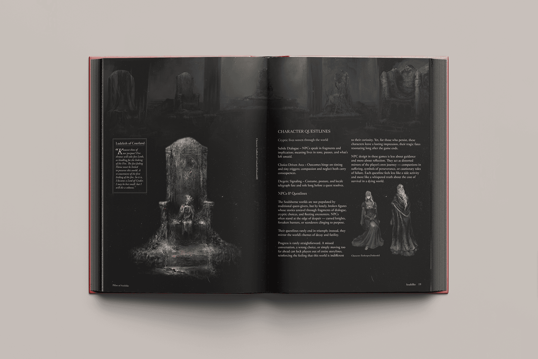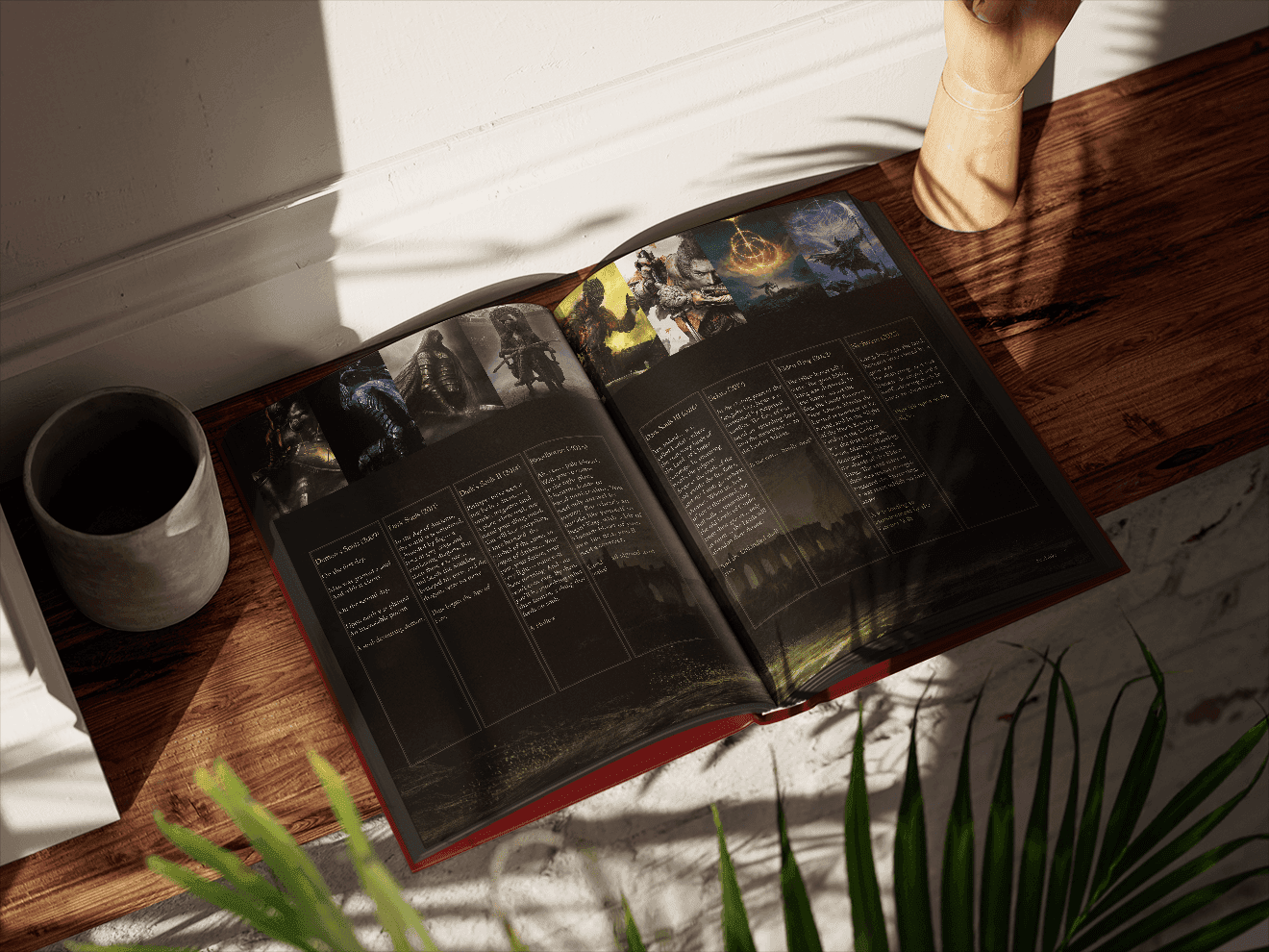 Design an editorial layout that captures the dark, atmospheric identity of the Soulslike universe while maintaining readability across image-heavy spreads and lore-driven text.