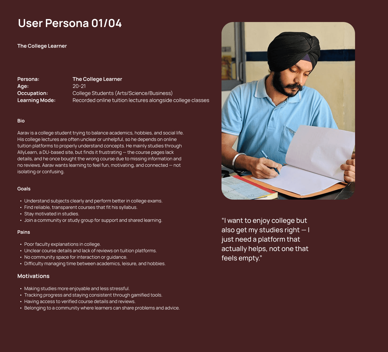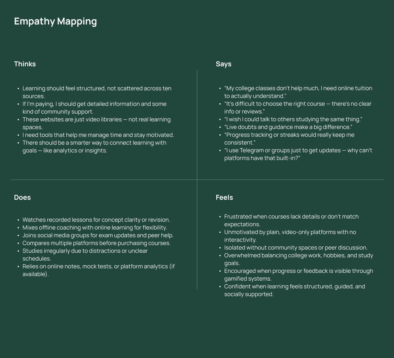 Online tuition platforms for higher education often feel overwhelming and fragmented. Students struggle with unclear navigation, scattered resources, and a lack of engaging touchpoints—leading to low participation, inconsistent usage, and reduced motivation over time.